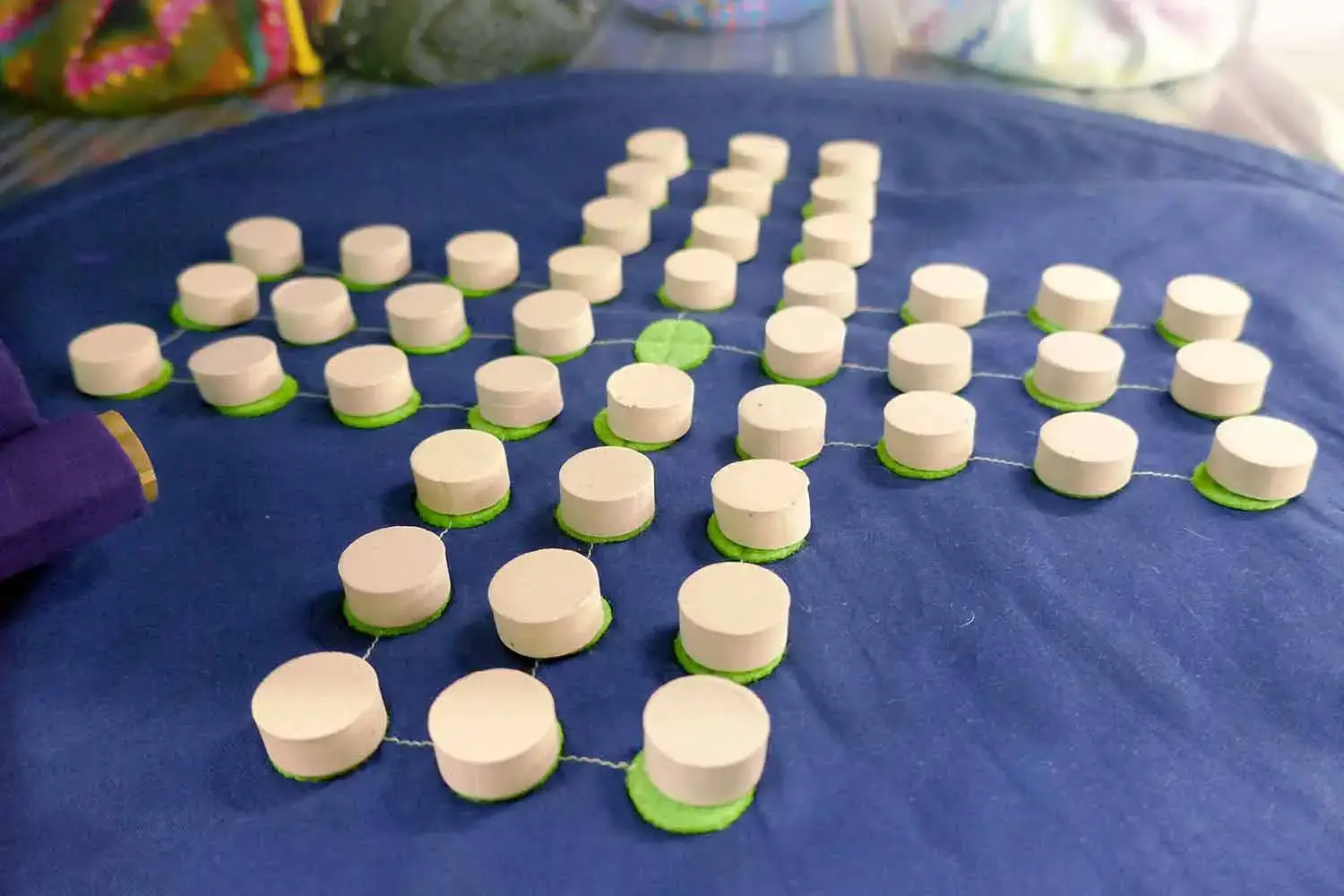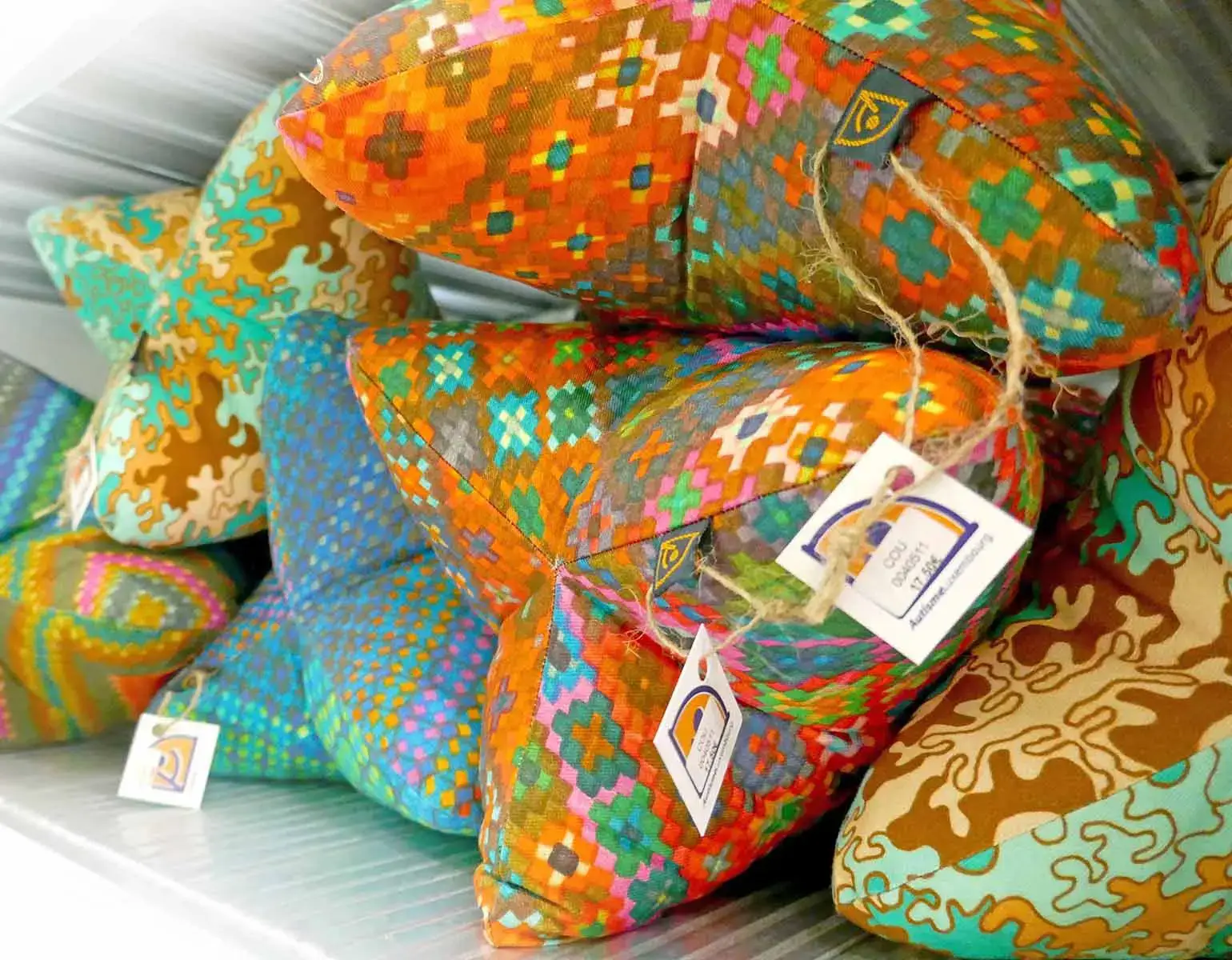 Une vraie particularité représente nos tissus en bio coton sur lesquels nous imprimons des motifs originaux et uniques conçus par certains de nos salariés handicapés présentant un trouble du spectre de l’Autisme.