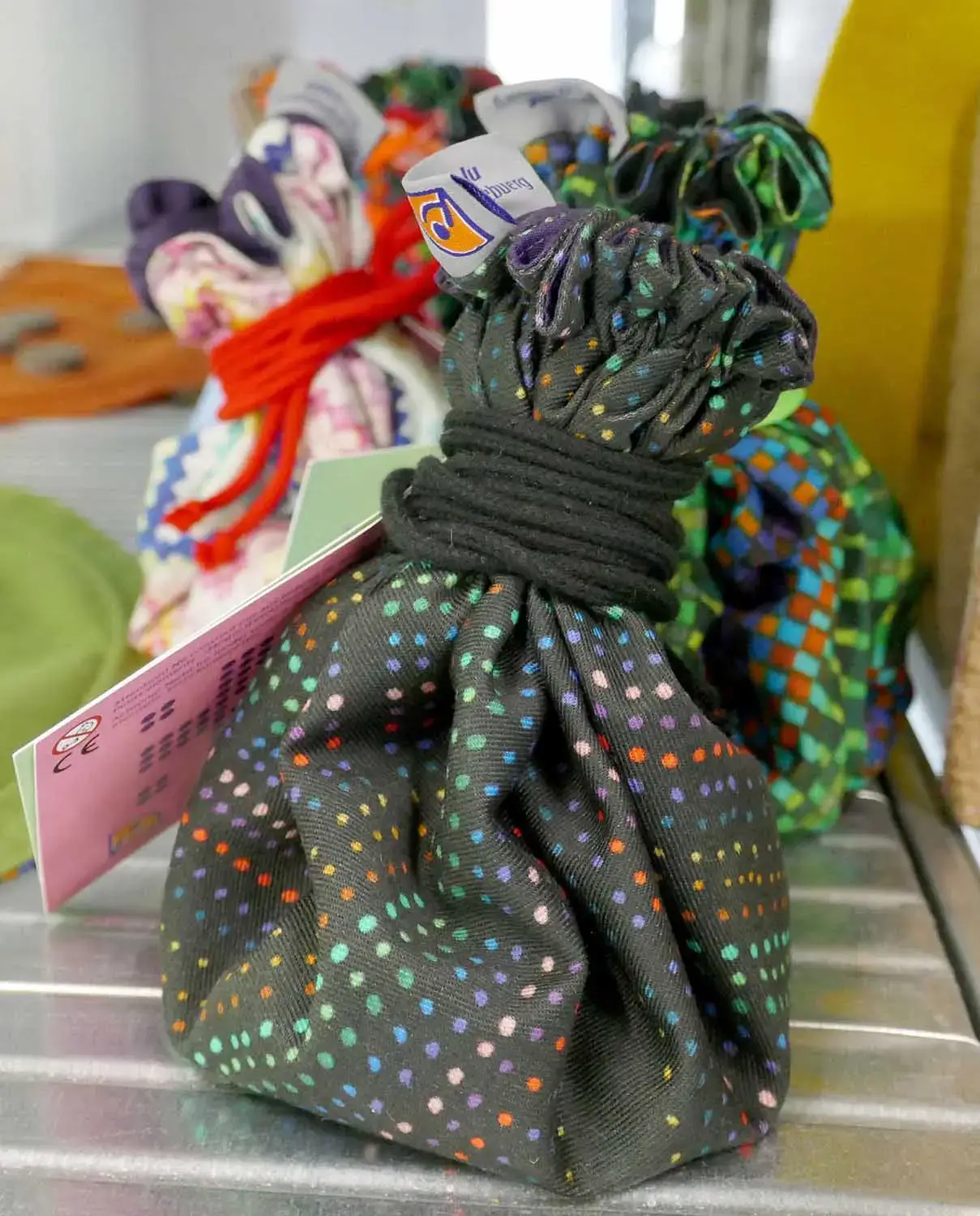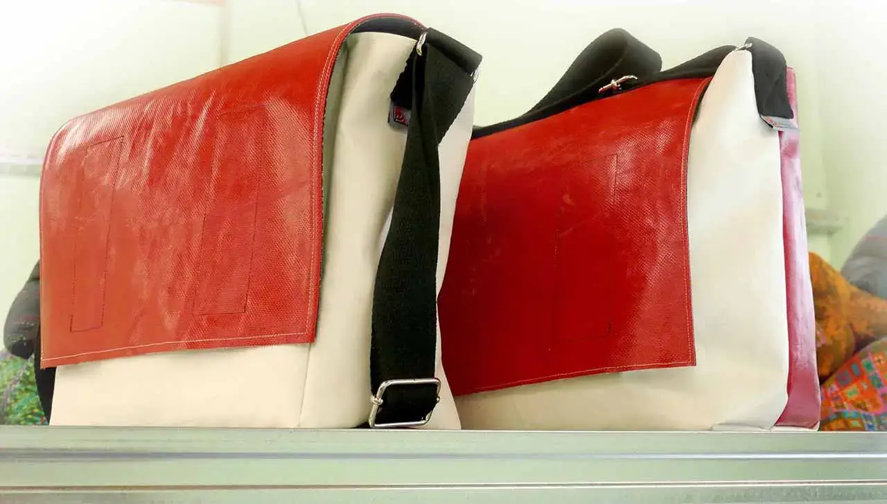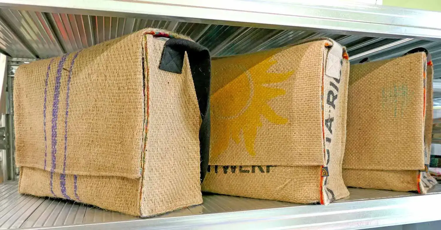Nous recyclons ainsi diverses matières telles que des sacs de café en jute, de la mousse de matelas, des bâches d’AirTramp ou de calicots, … Nous pouvons ainsi confectionner de nouveaux articles diversifiés, multicolores et multiformes, avec un tout nouveau design de présentation et une nouvelle utilisation fonctionnelle.
