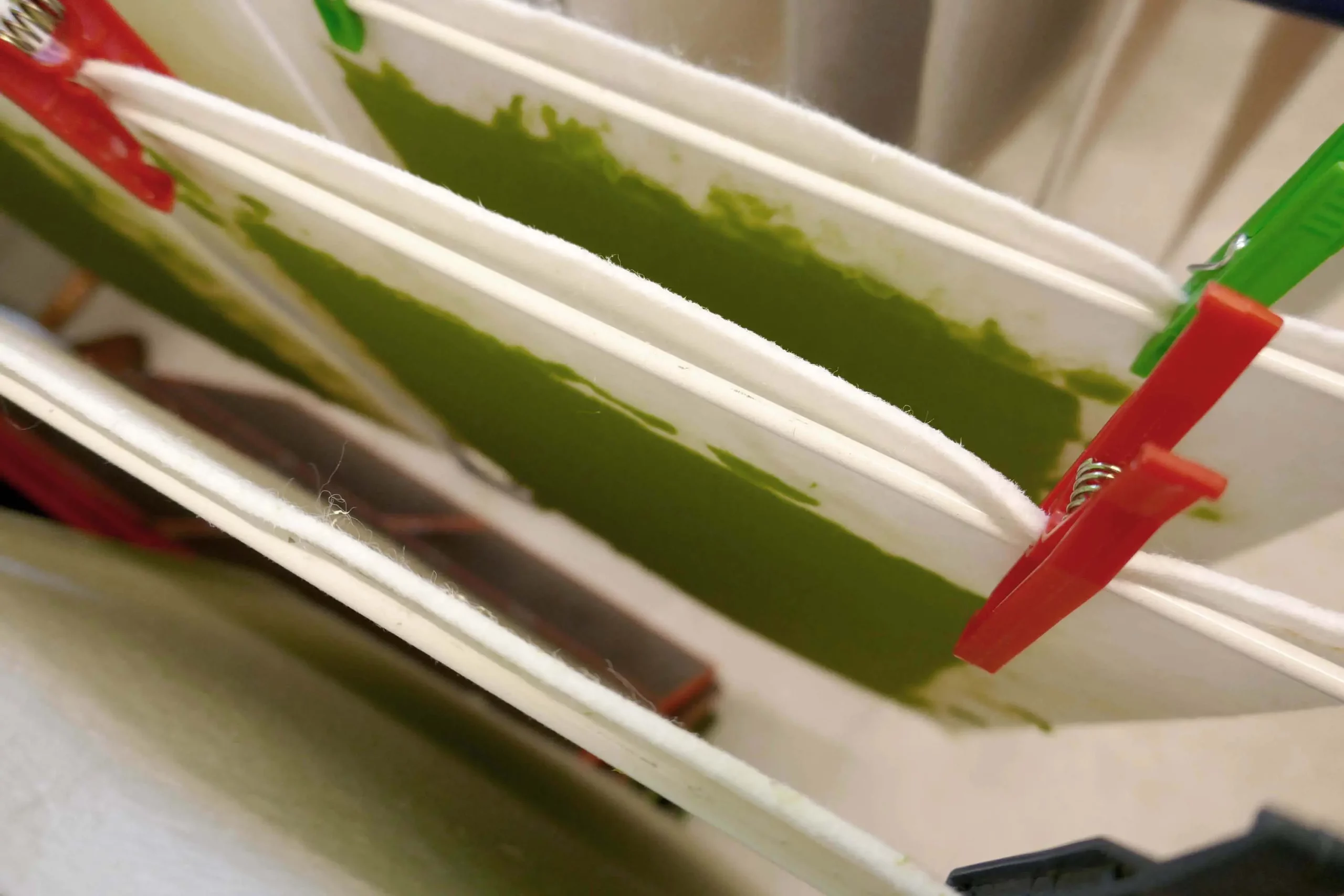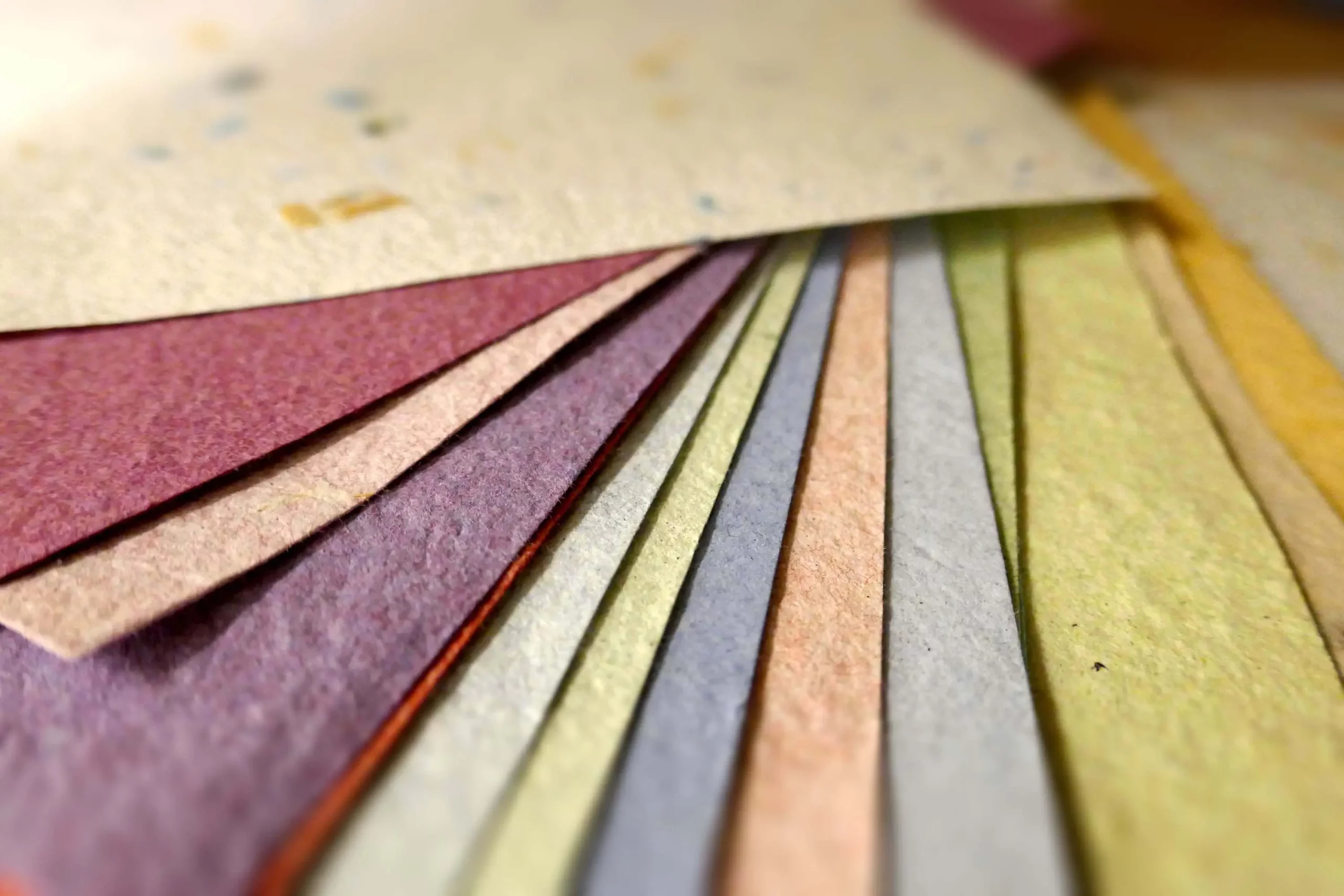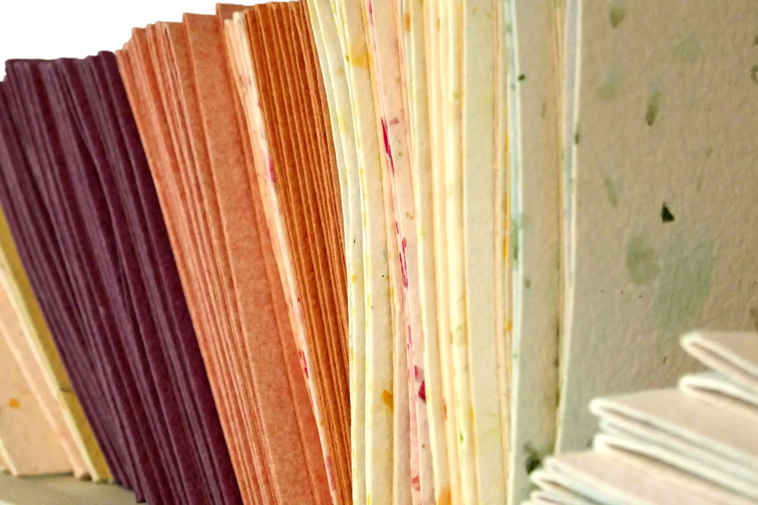 Le papier est fabriqué à partir d’une masse composée de vieux papier et de papier résineux qui est mixée finement et à laquelle on ajoute divers particules (plantes, fleurs, pelures, papier couleurs, …) qui vont venir former la structure et la couleur de base de la feuille de papier.