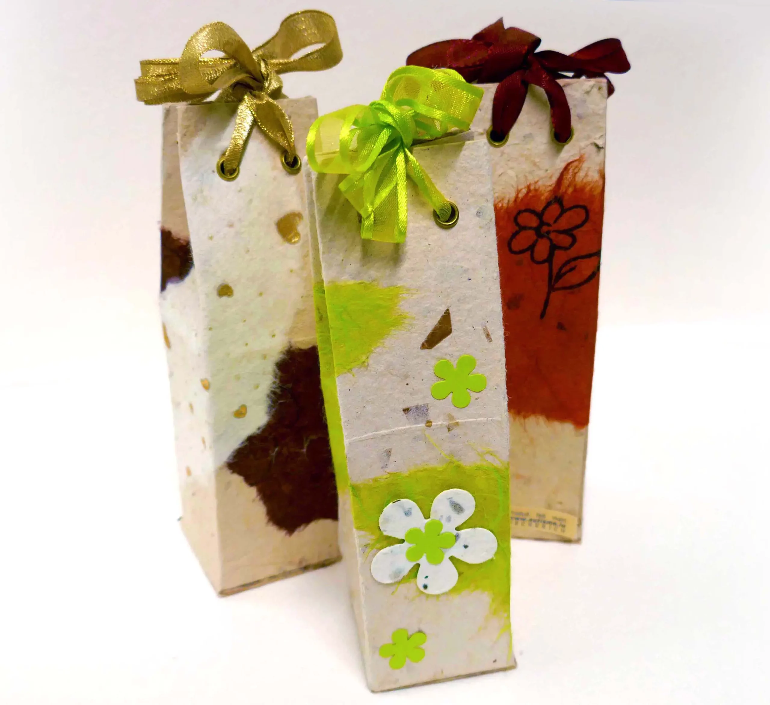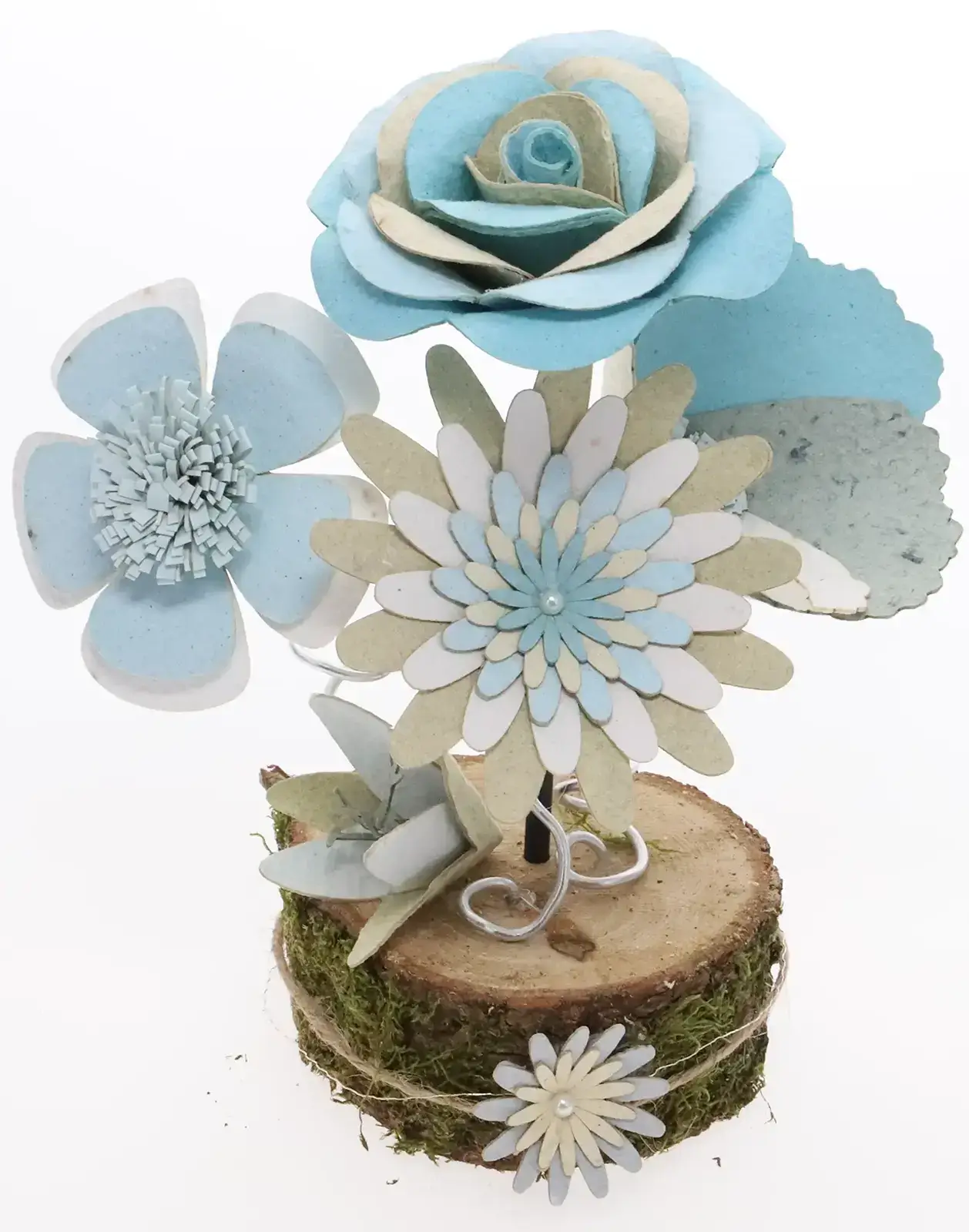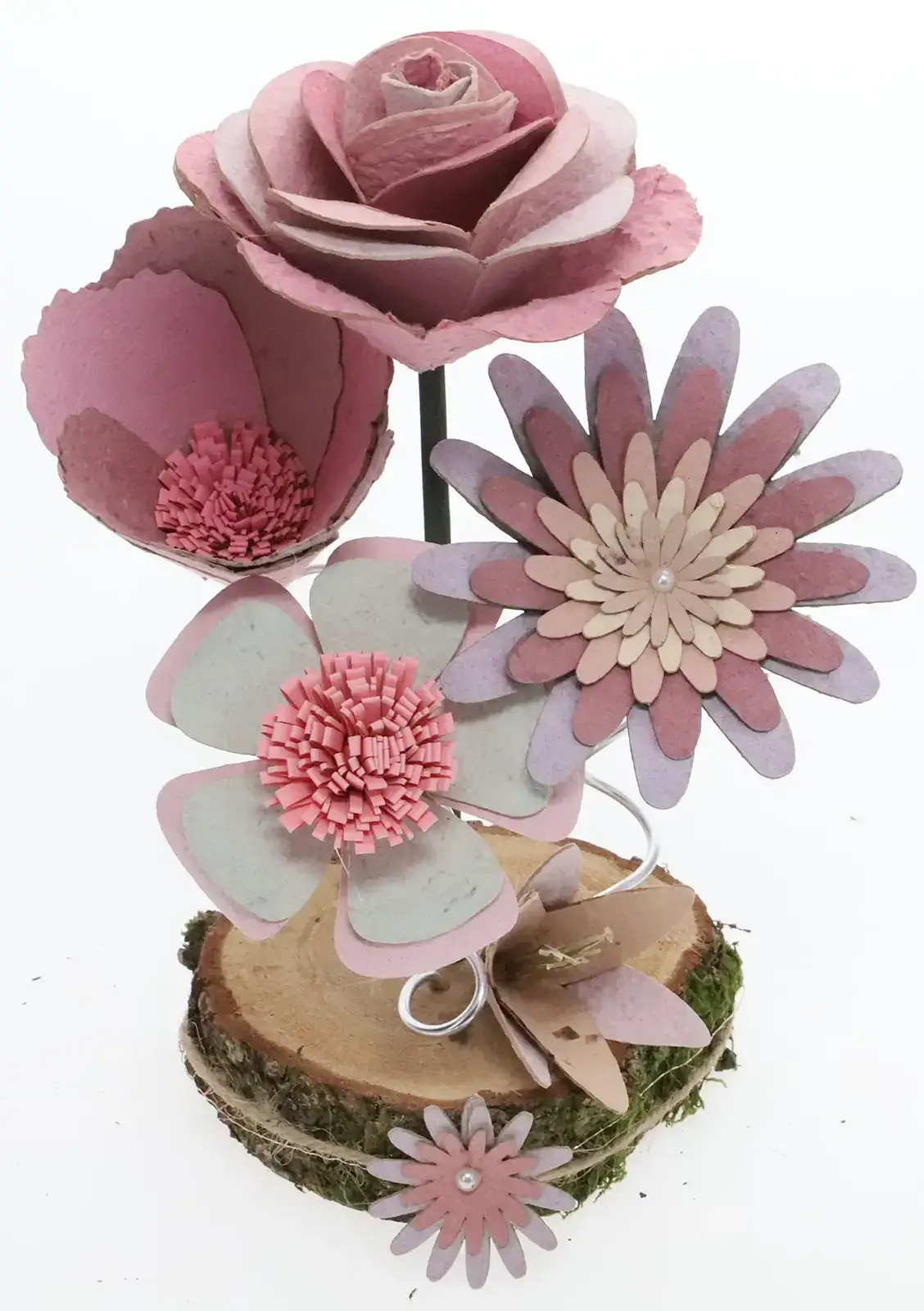 Le papier est fabriqué à partir d’une masse composée de vieux papier et de papier résineux qui est mixée finement et à laquelle on ajoute divers particules (plantes, fleurs, pelures, papier couleurs, …) qui vont venir former la structure et la couleur de base de la feuille de papier.